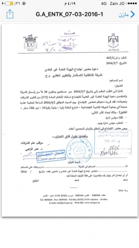 وبناء على طلب تقدم به 30% من مساهمي الشركة وافقت مراقبة الشركات على عقد اجتماع غير عادي بتاريخ 2/4/2016 حيث استندت المراقبة لأحكام المادة 172 من قانون الشركات والتي تنص على أنه "تعقد الهيئة العامة للشركة المساهمة العامة اجتماعاً غير عادي داخل المملكة بدعوة من مجلس الادارة او بناء على طلب خطي يقدم الى المجلس من مساهمين يملكون ما لا يقل عن ربع اسهم الشركة المكتتب بها او بطلب خطي من مدققي الحسابات الشركة او المراقب اذا طلب ذلك مساهمون يملكون اصالة ما لا يقل عن (15 %) من اسهم الشركة المكتتب بها.