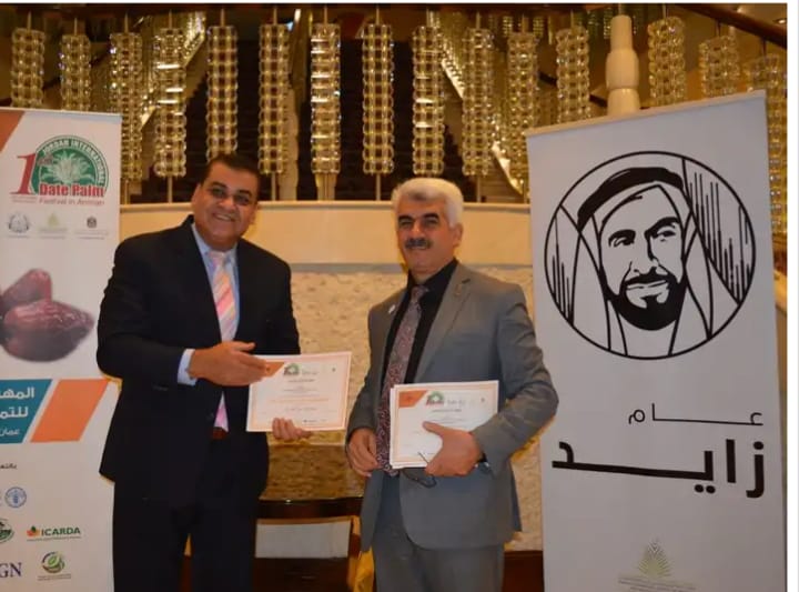 والدكتور عماد سعد مسؤول المركز الاعلامي،مدير تحرير مجلة الشجرة المباركة وسط اجواء اسرية وفرحة غامره تم تكريم كافة المشاركين بدروع مقدمة من جمعية التمور الاردنية وشهادات تقدير من جائزة خليفة الدولية لنخيل التمر والابتكار الزراعي وتم تكريم كوكبة من الاعلاميين والاعلاميات من كافة وسائل الاعلام الاردنية والاماراتية وسعودية وعربية مشاركة