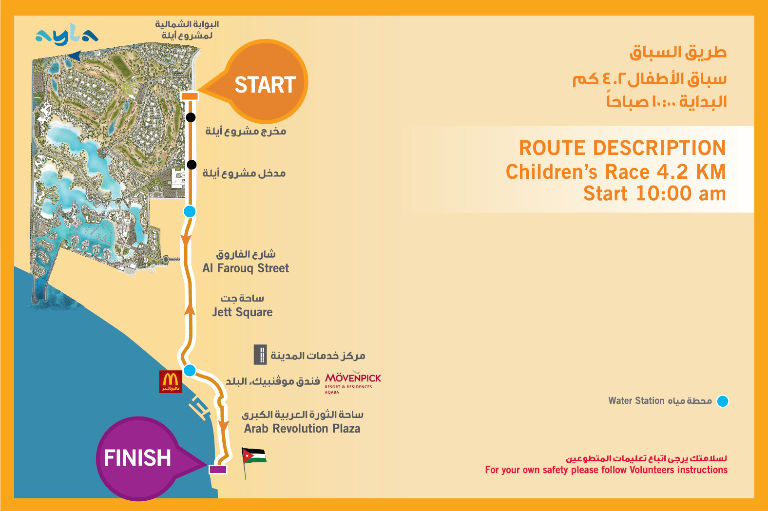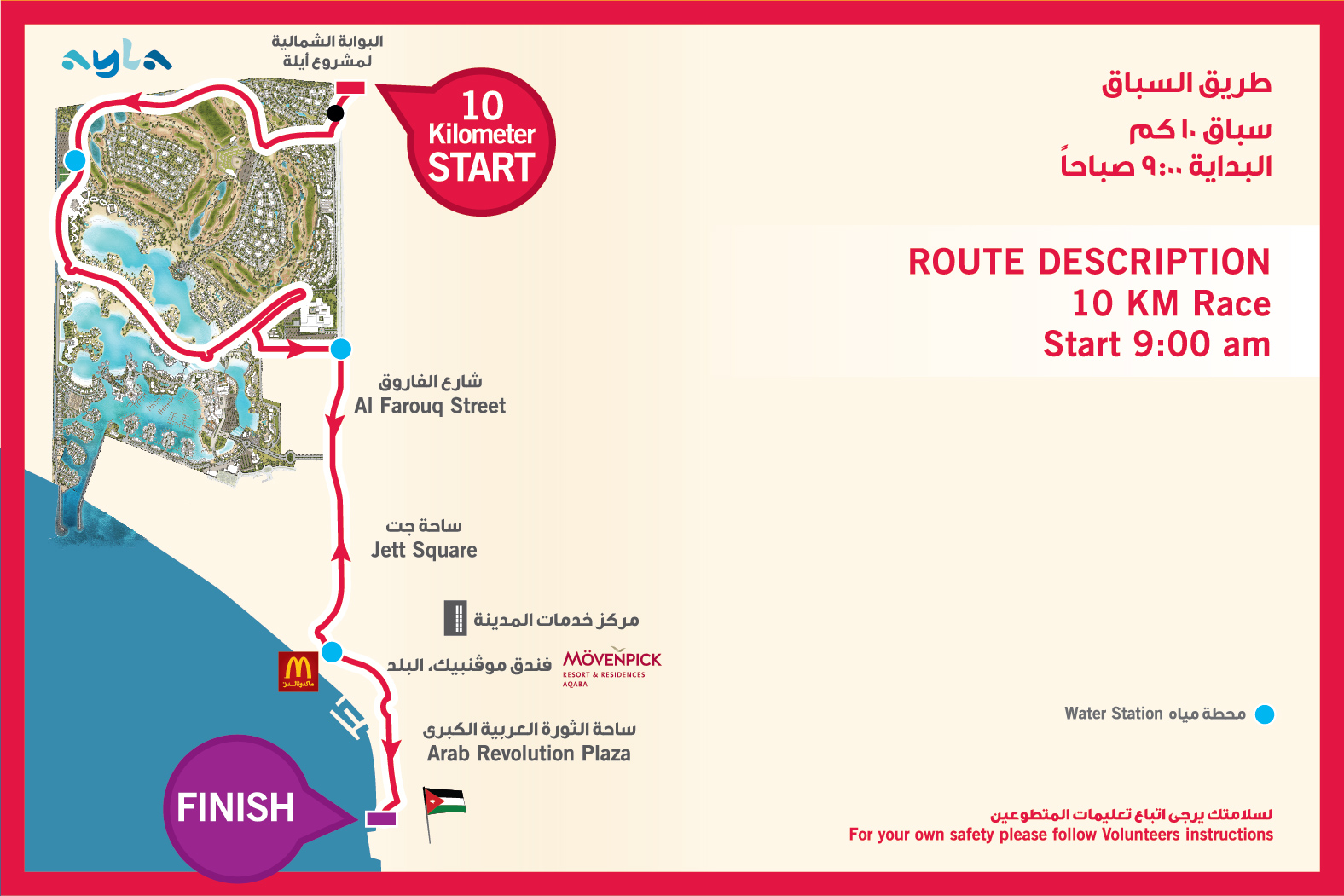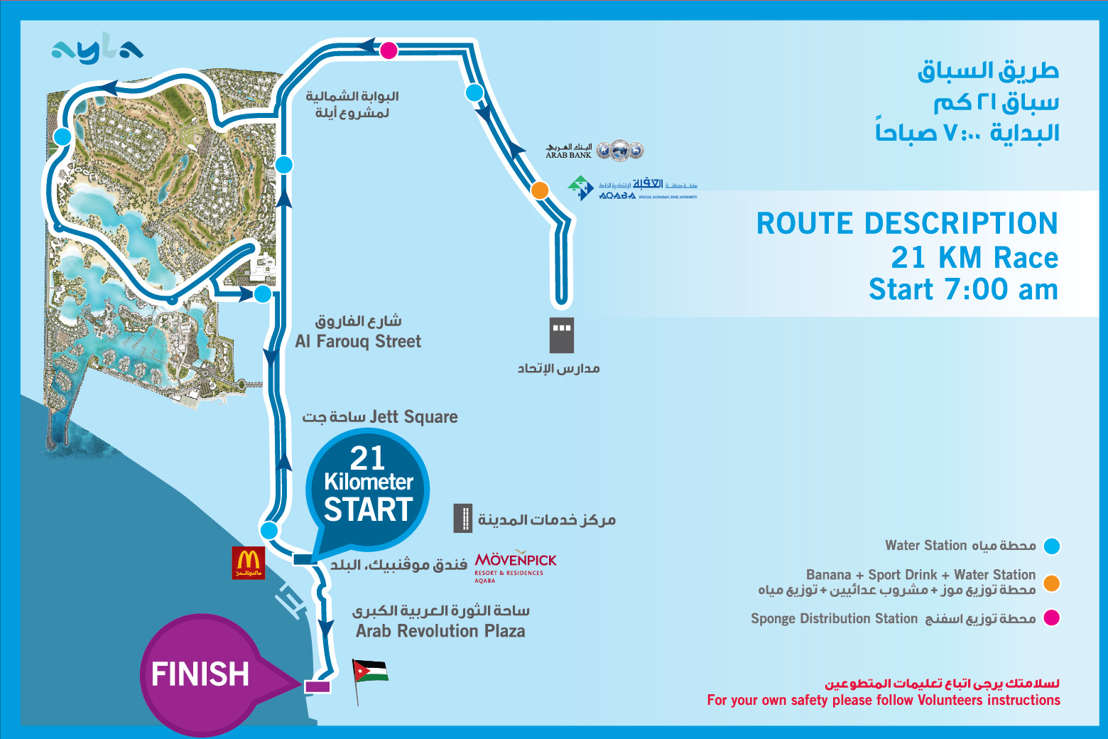يتضمن الماراثون 3 سباقات رئيسية؛ سباق النصف ماراثون (21 كم) الذي سينطلق في تمام الساعة 7:00 صباحاً من أمام مدخل فندق موفنبيك – البلد، شارع الملك الحسين، سباق 10 كم، والذي سينطلق الساعة 9:00 صباحاً قبل البوابة الشمالية لمشروع آيلة، شارع الفاروق، وسباق الأطفال (4 كم) والمقرر إطلاقه الساعة 10:00 صباحاً، من قبل بوابة الدخول لمكاتب مشروع واحة آيلة، شارع الفاروق.